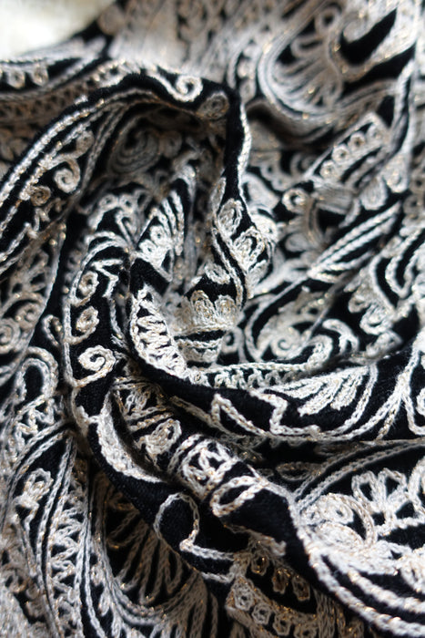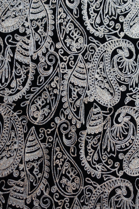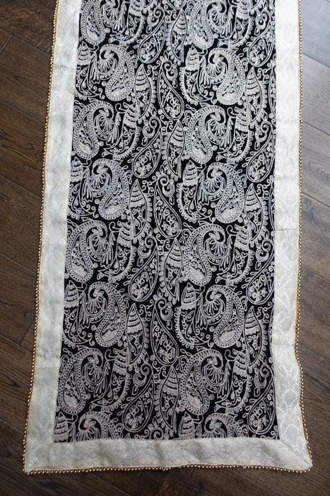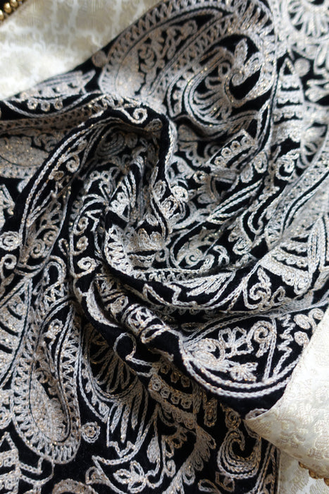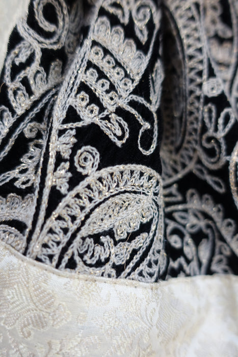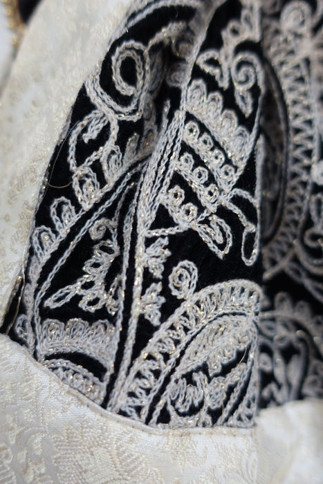 Description – this is embroidered in beige and gold, it has a wide cream and gold brocade trim edged with a gold beaded trim.