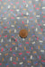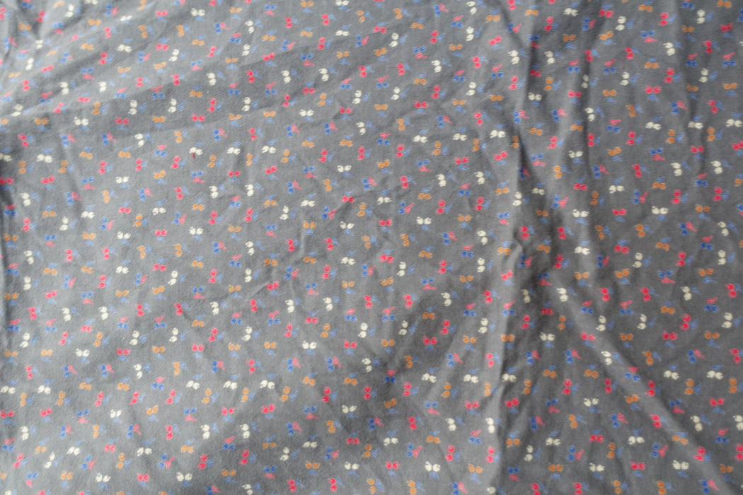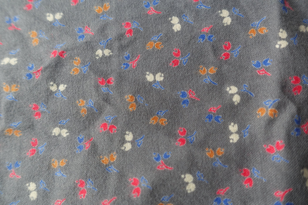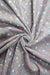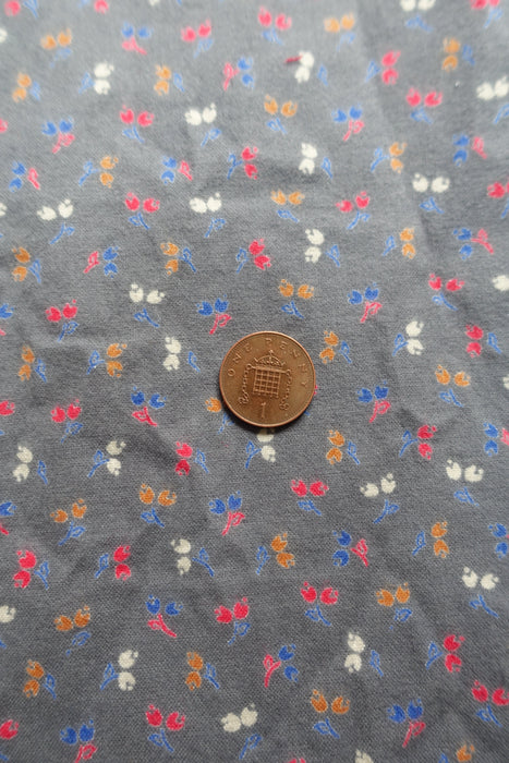 This is a printed cotton fabric; it has a grey background with a colourful print on it.