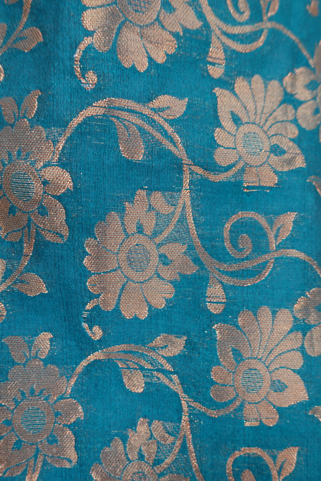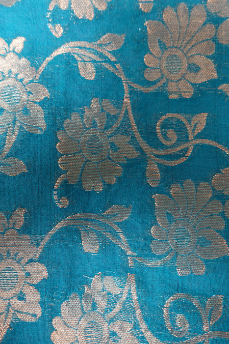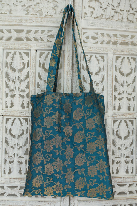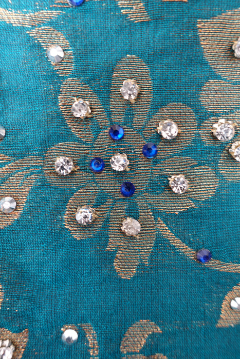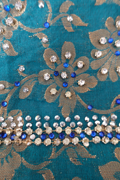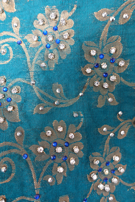 This is made of a rich cotton silk blend, it has gold thread woven through the fabric in a floral design. One side of the bag is studded with sparkling stones and sparkling hot dots.