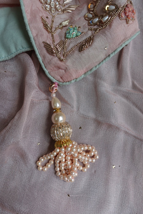 Kameez is made of silk, it has striking embellishment work made up of zardosi, thread work, beading, sequins and and small pearls, the back has similar detailing. It comes with a side zip fitting and beaded latkans.