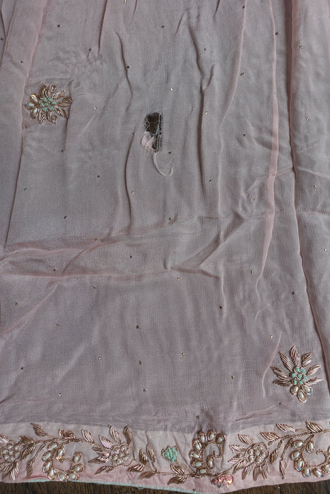 Dupatta is made of a fine silk, it has silver mukesh work and has light gold zardosi, bead, braid and sequinned detailed trim around the outer edges. It does have a small tea (see image) this can be repaired or alternatively covered with sequins. It has beaded latkans in each corner.