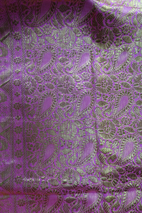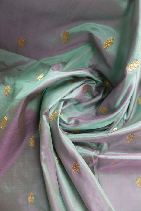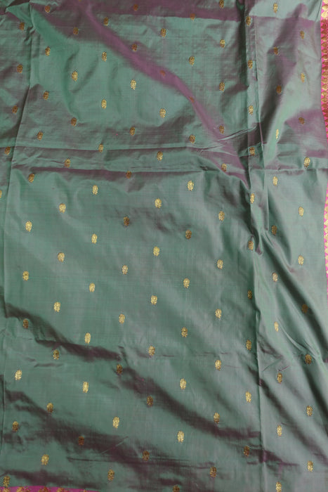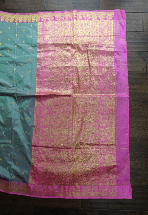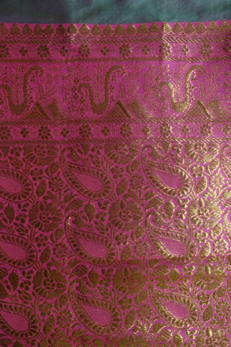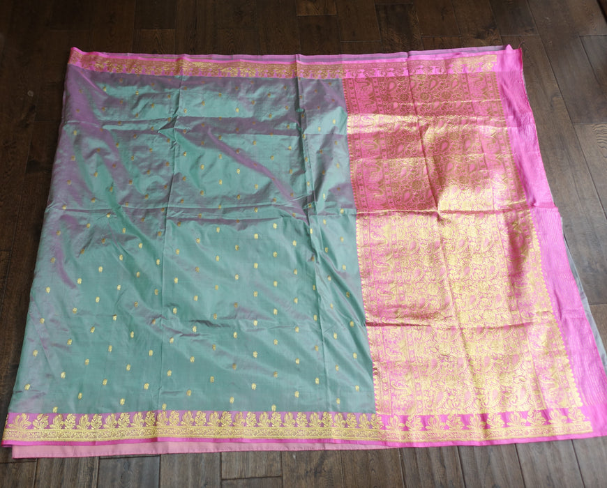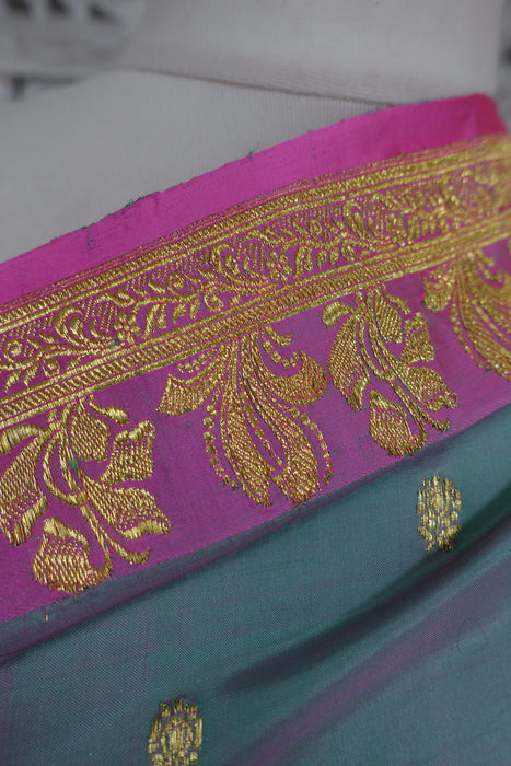 Description: This is a beautiful 2 tone sage green and pink pure vintage silk sari with bright gold zari thread work.