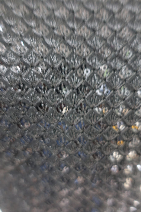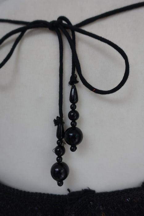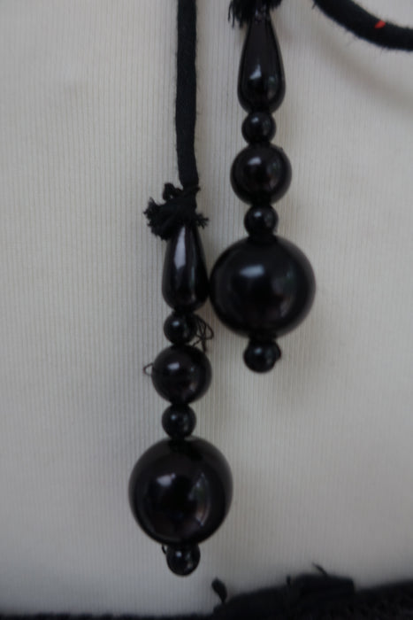 This is a mid-length sleeved choli blouse, it is made of embroidered and black sequinned fabric, the front has dark black and dare red stone work around the neckline. Some of the stones are missing however it is not obvious.