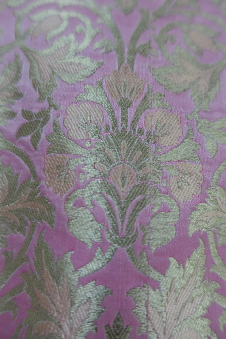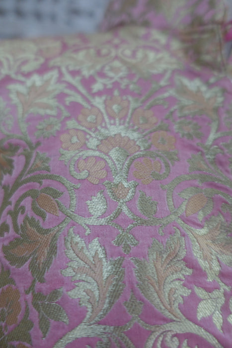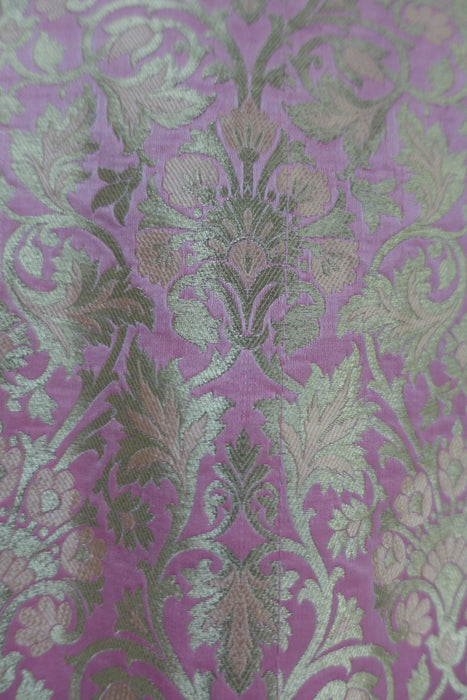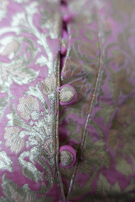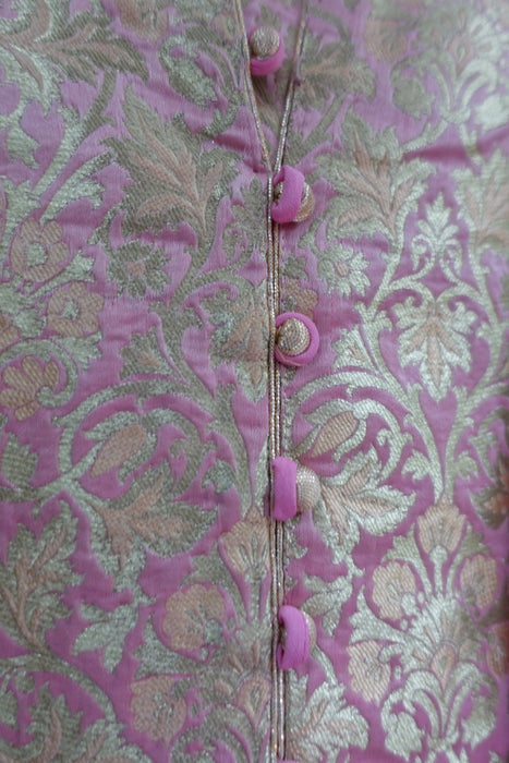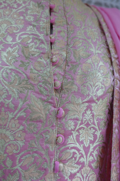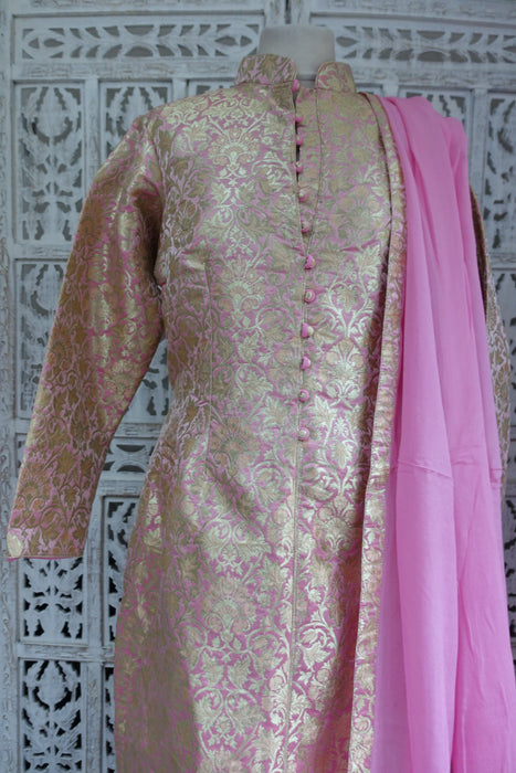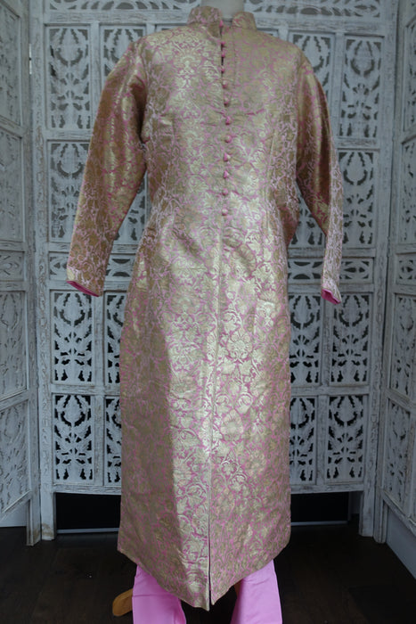 Kameez is made of a rich brocade and lined in synthetic chiffon. it has a small collar with faux button fastening with hooks and eyes underneath. Pyjami is bias cut and is made of a fine unlined silk.
