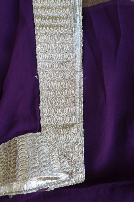 Dupatta is made of chiffon and finished with a wide gold braid trim.