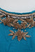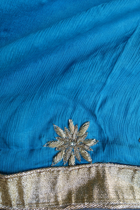 Dupatta is made of a crushed silk, it has zardosi starburst flowers uniformly and is finished with a gold braid trim.