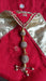 Kameez is made of silk, the front is heavily embellished with masses of beads, sequins and sparkling stones / diamante in different shapes and sizes. The back has lesser detailing with latkans to secure. (these have been crushed and will need to looked at or replaced). This has been let out of the seams for alteration so some of the stitch holes are visible. Similarly the darts at the back have been taken out. This can easily be made a size smaller. The size indicated is what it currently measures as.