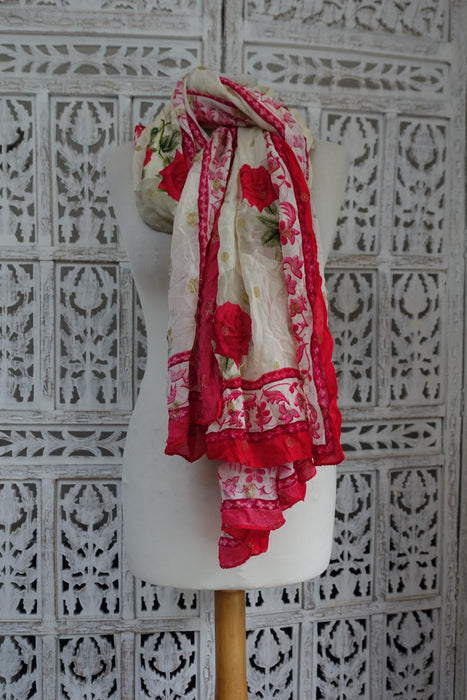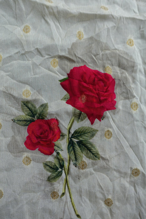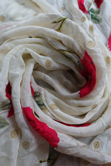 Cream And Red Blend Rose Print Crepe Silk Dupatta - New