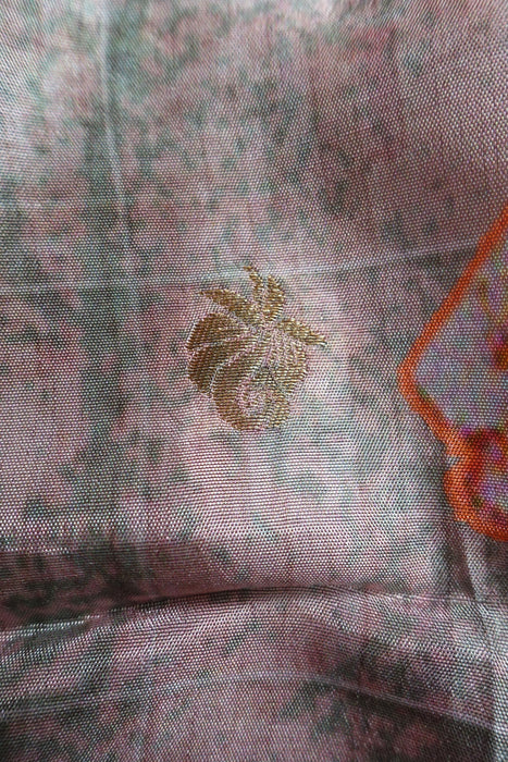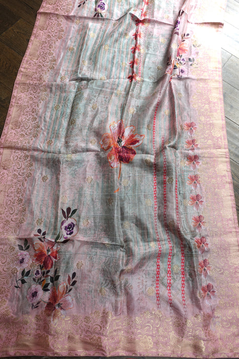 Description – This is made of chanderi silk and has a printed floral design woven through with gold thread work picking out the design. It has piped edges