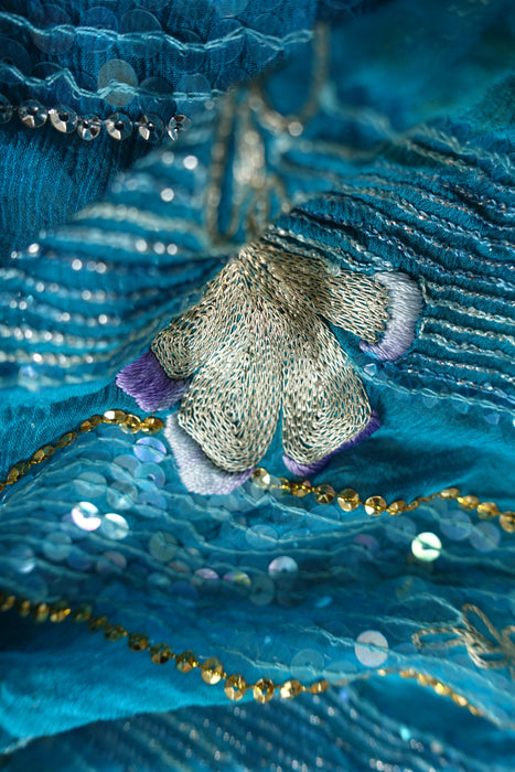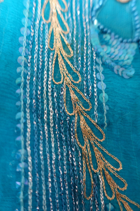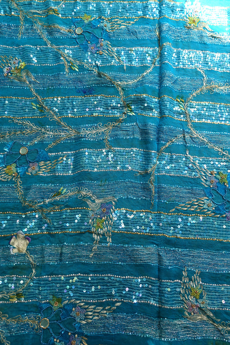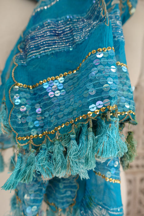 Description – this is a vintage pure silk chiffon dupatta, it is embellished in a myriad of iridescent opaque sequins, tilla, mirror and zardosi, silk thread work and is finished with silk tassels. It does have some colour run which can be seen in the pictures.