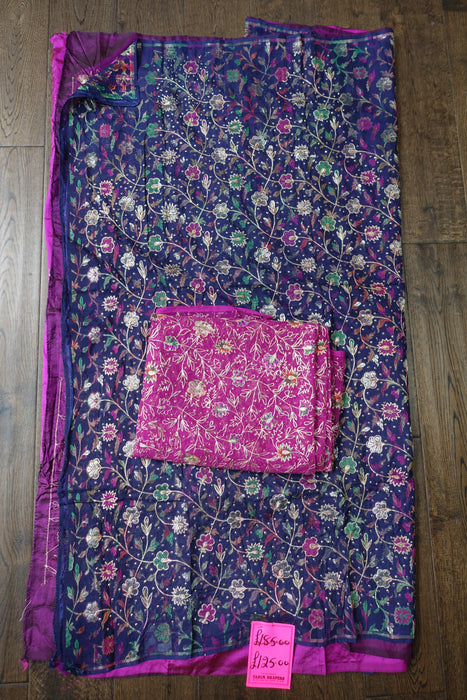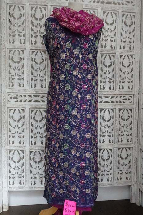 Colour: Navy blue and pink. Kameez is the printed fabric with plain silk for the salwar / bottoms.