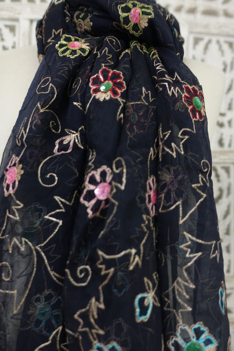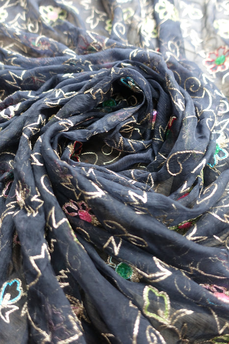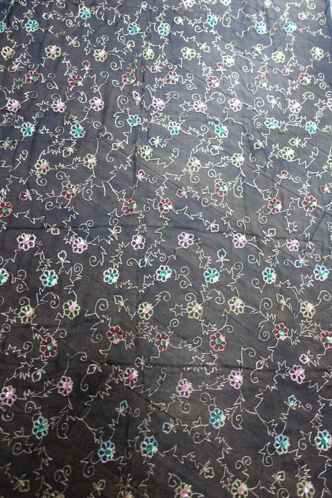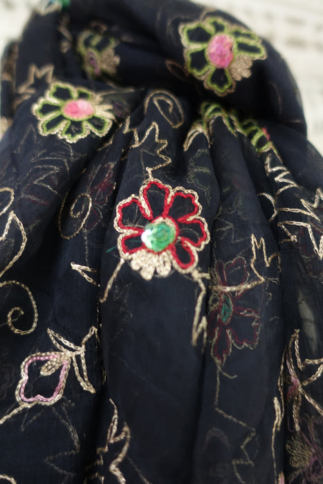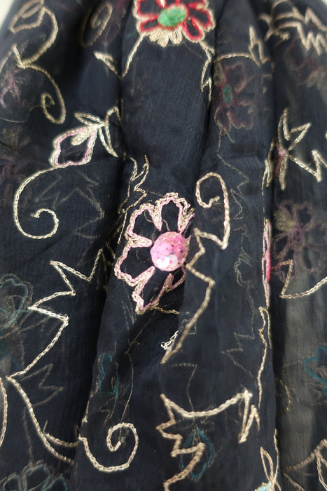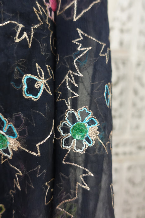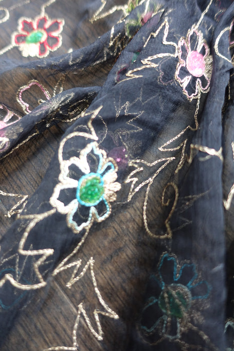 Description – black vintage chiffon it is hand worked with lots of gold tilla embroidery as well as translucent sequins and colourful thread work has a scallop edge finish.