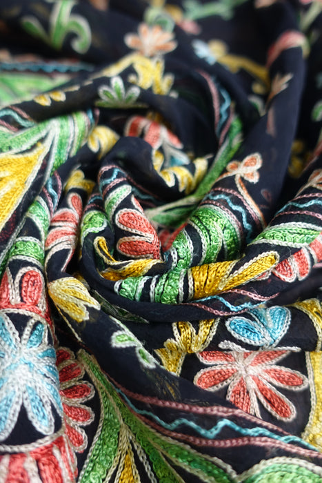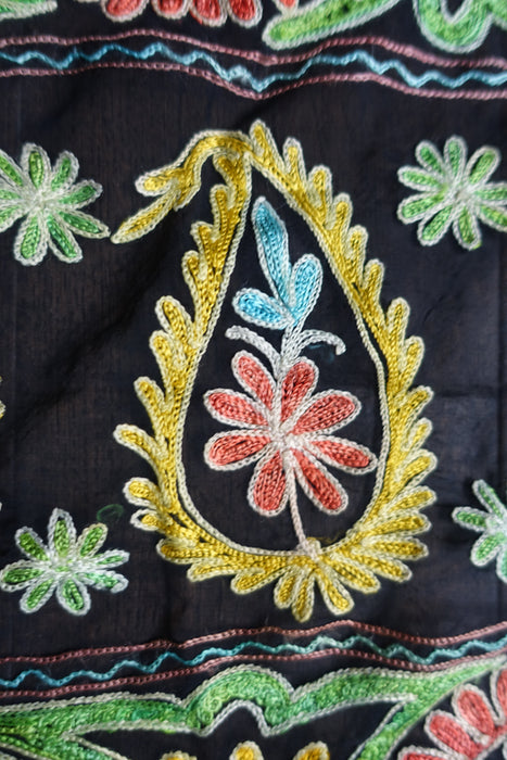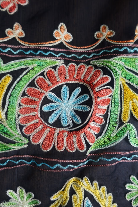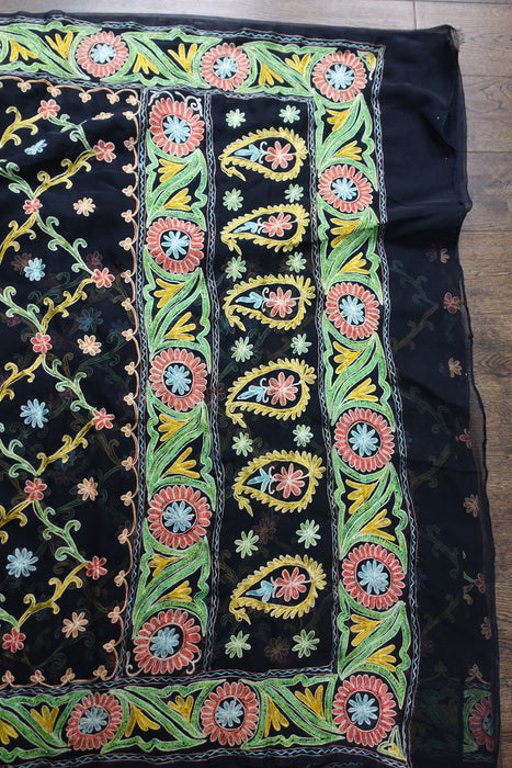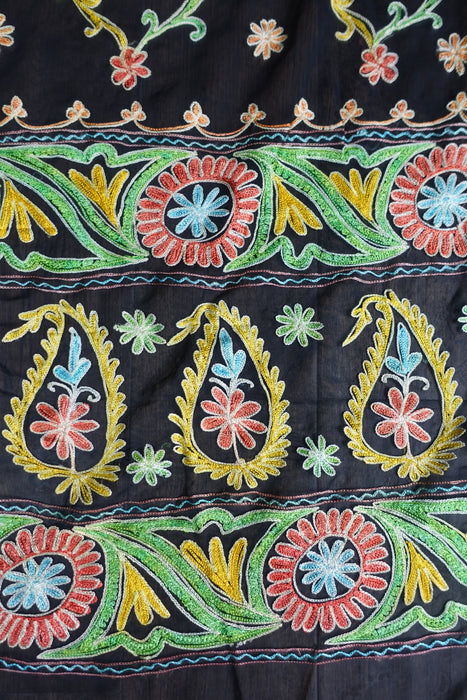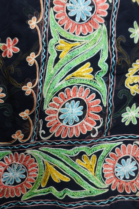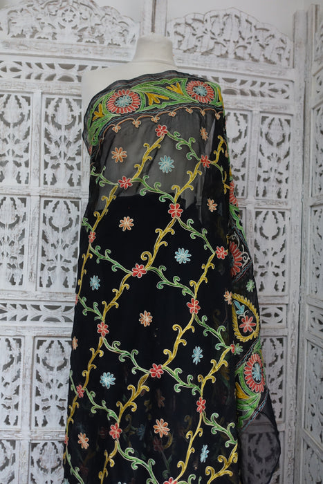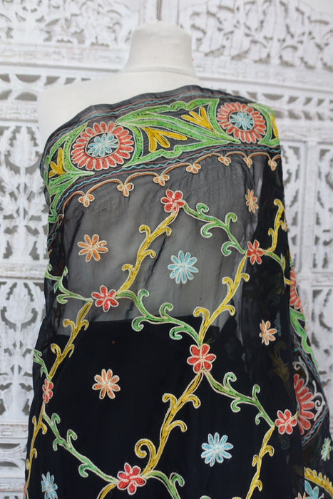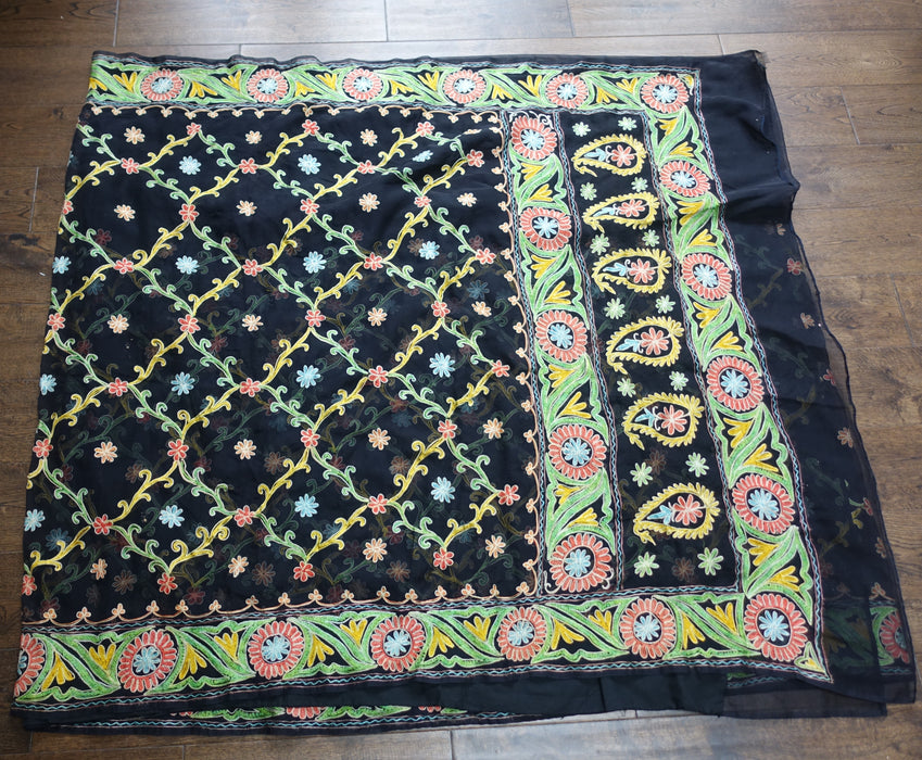 This is a stunning vintage hand embroidered sari, it is made of American georgette and is colourfully embroidered al over in shades of bright green, coral pink, white, yellow and tan amongst other. It is unworn and has been taken from a bridal trousseau that is around 40 years old. This is a very unusual piece and is in excellent condition.