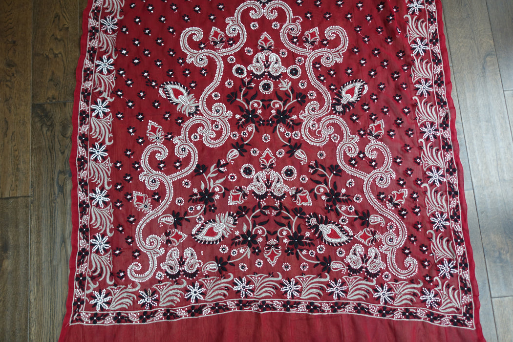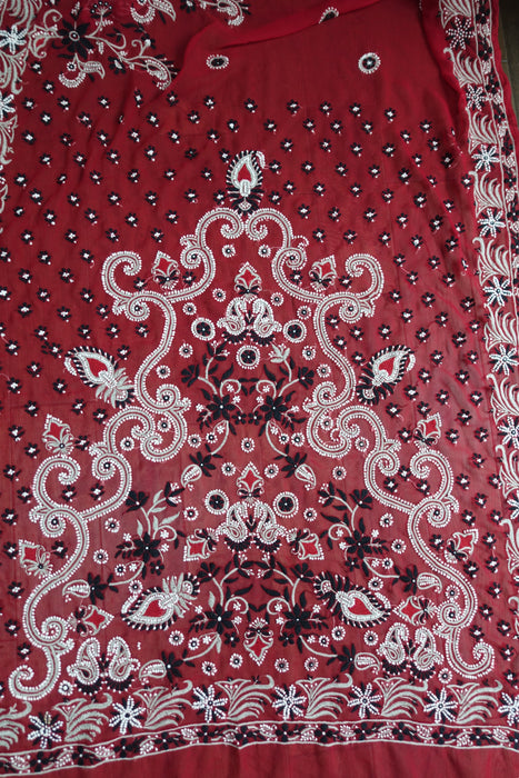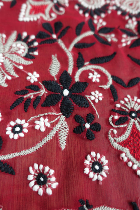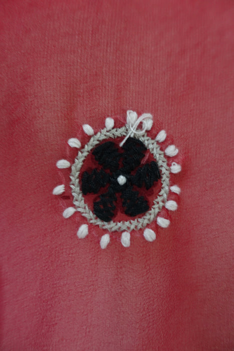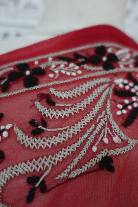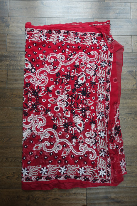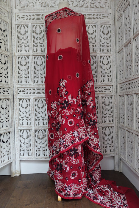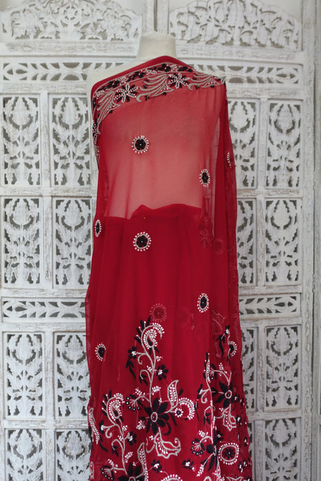 Red Chiffon Vintage Embroidered Sari - Preloved