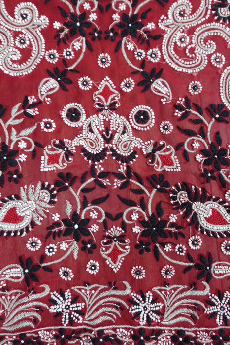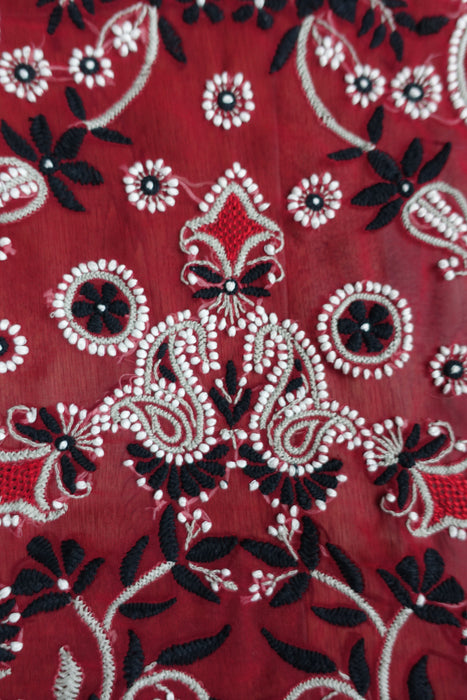 This is a vintage red chiffon sari, it has beautiful grey, white and black thread work embroidery, this is heavier on the palla.