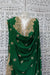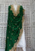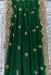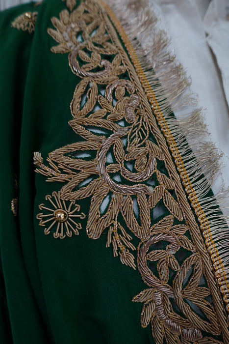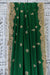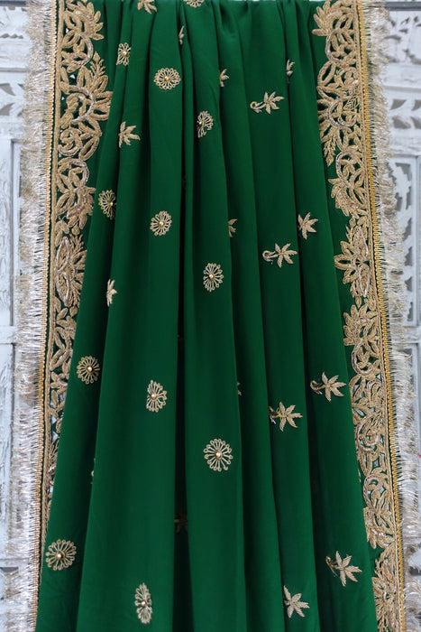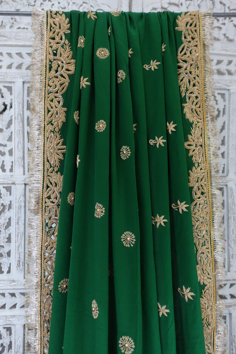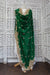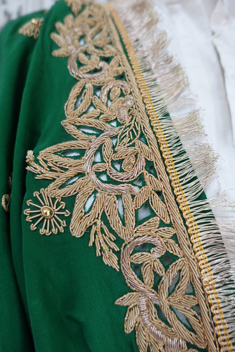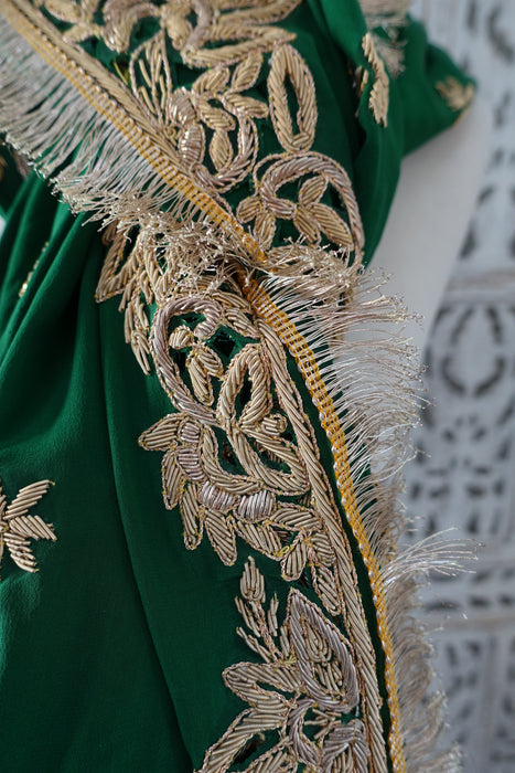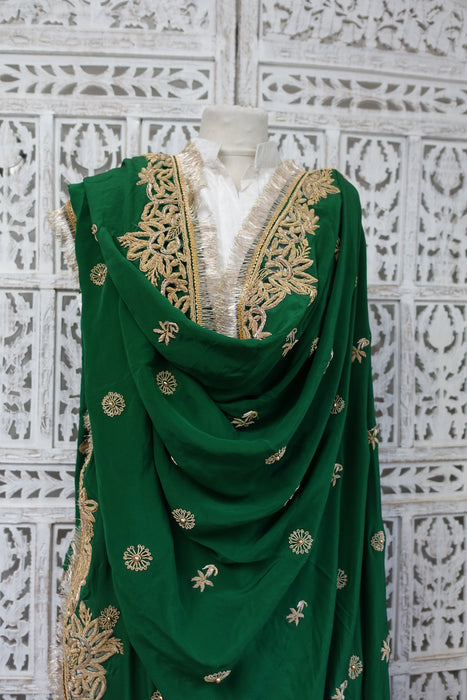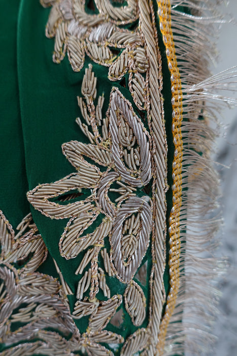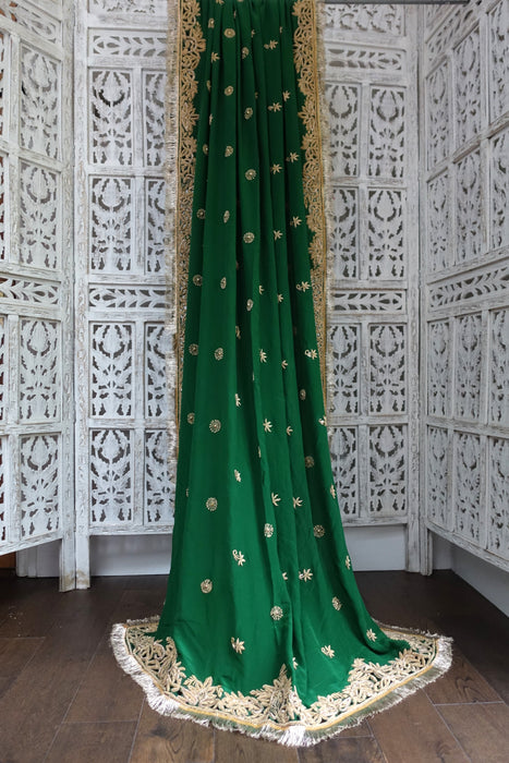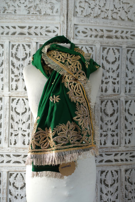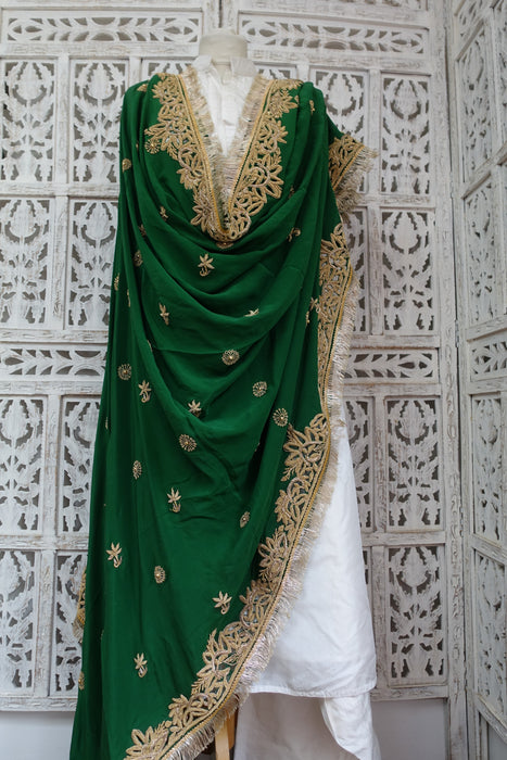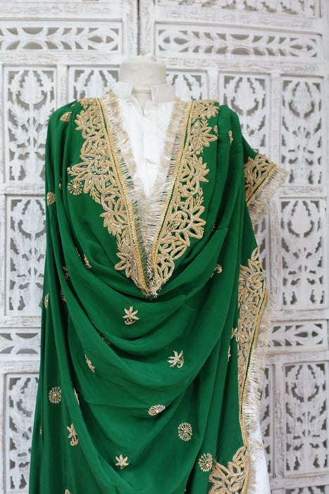 Description – this is a green pure silk vintage dupatta with lots of gold raised zardosi work and cutwork and finished with a gold zari thread fringe.