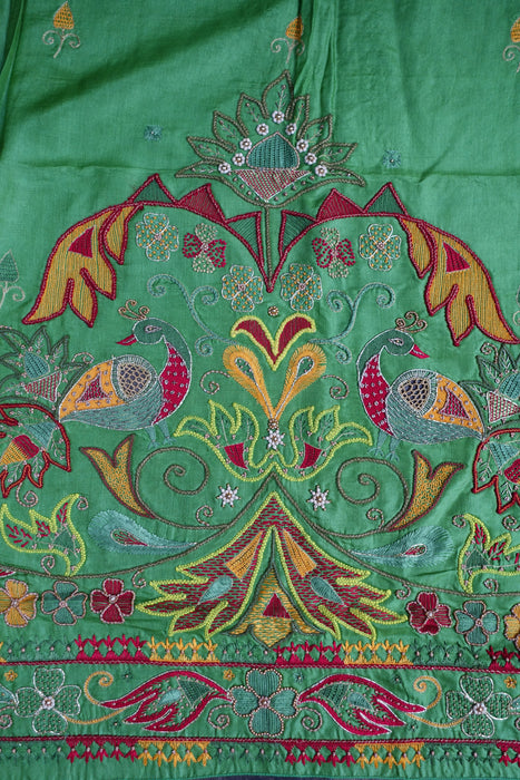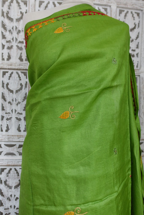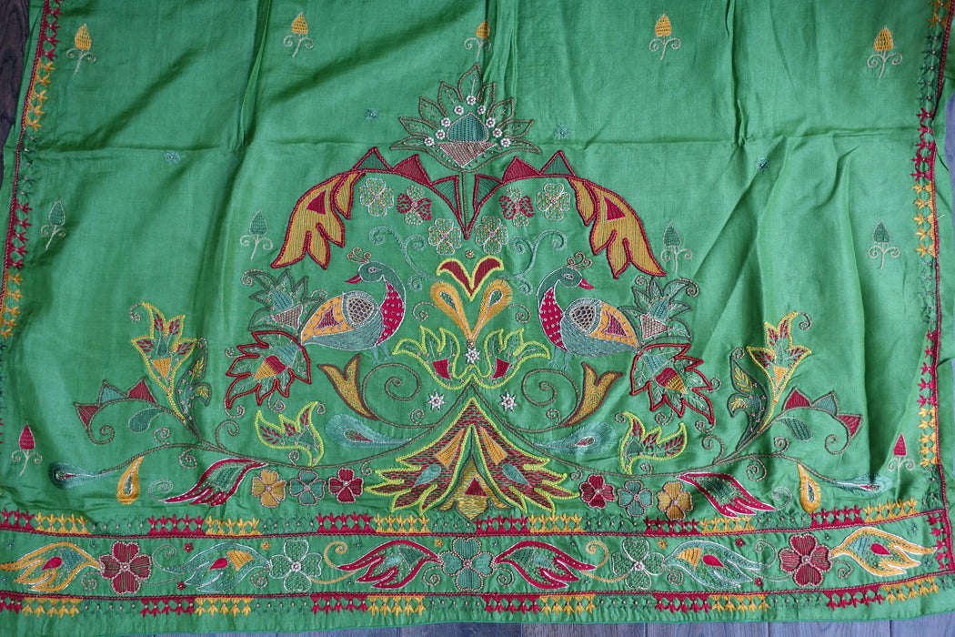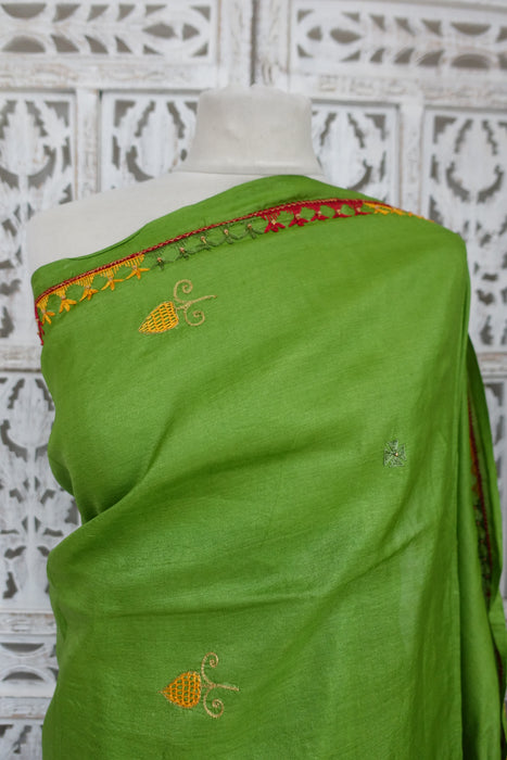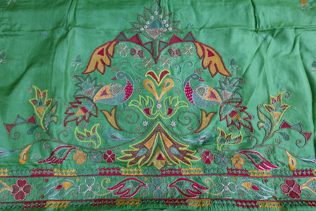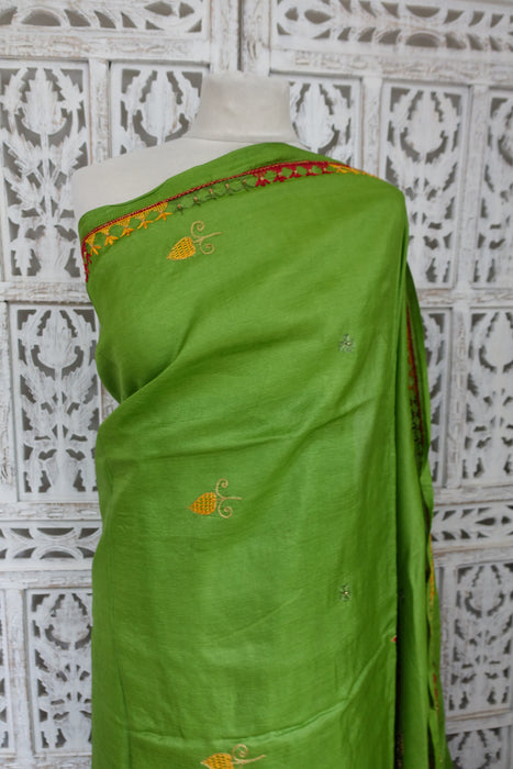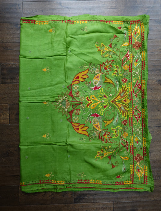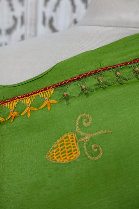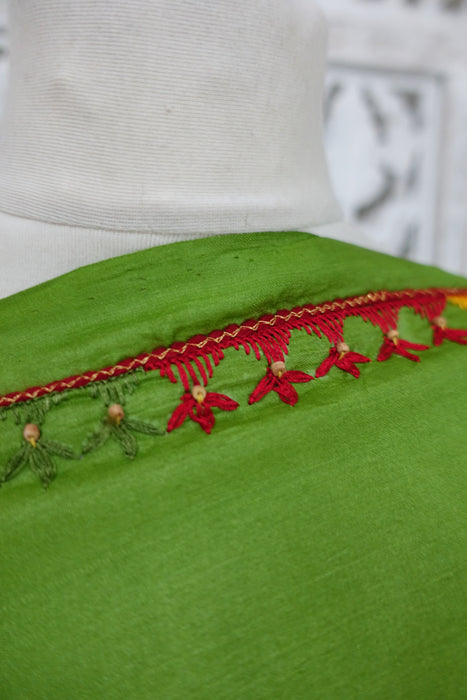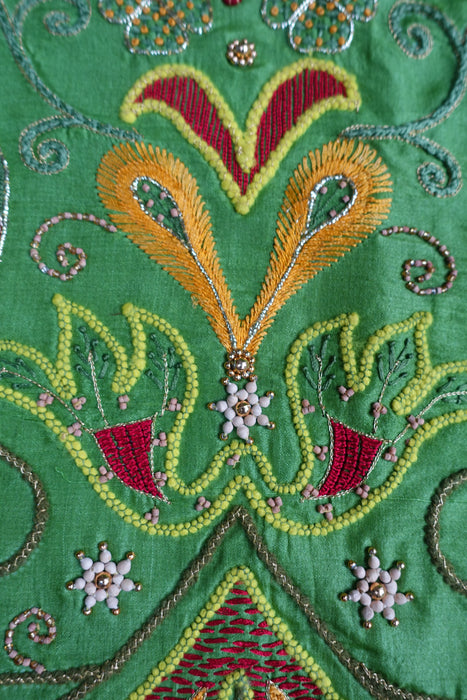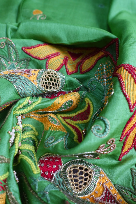 This is a stunning vintage apple green tissue silk sari, it is from around 1996. It is hand embellished with details including beading in varying shapes and sizes, thread work, zardosi and cutwork. It is a fabulous example of extensive handicrafts. The fabric for the blouse is included and is attached to one end.