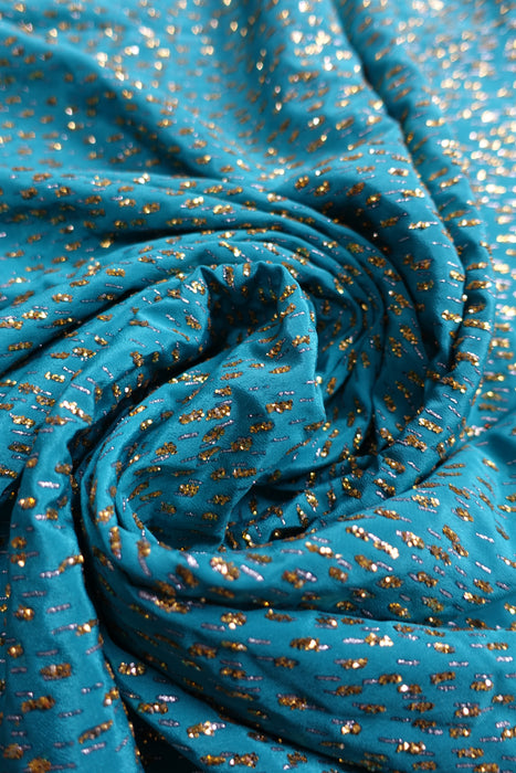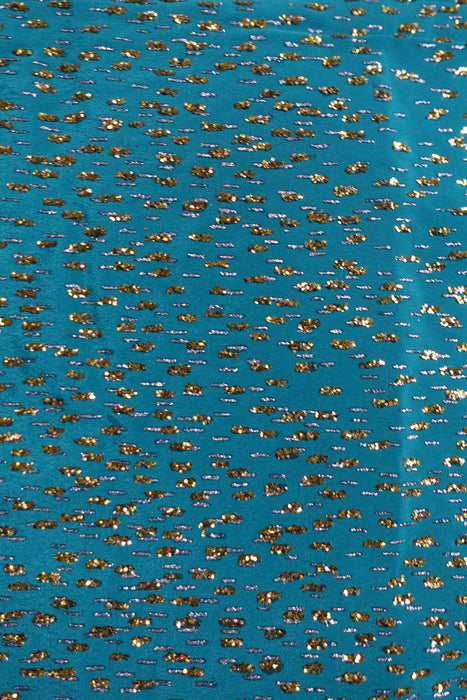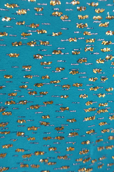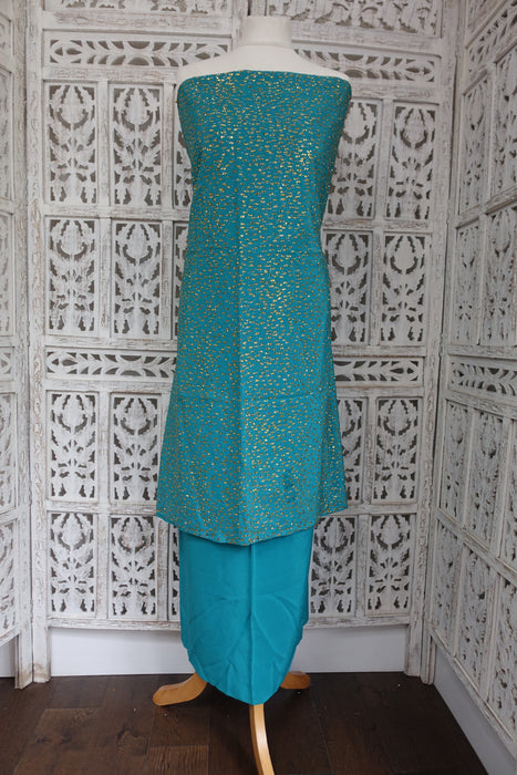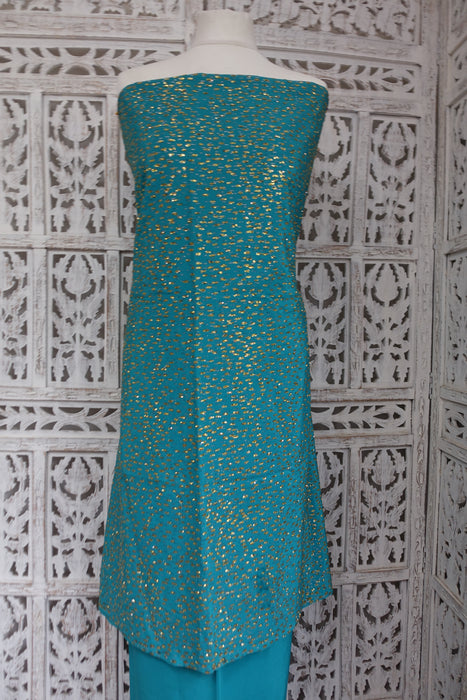 Description – this is a traditional vintage crepe two piece, the kameez has gold glitter and silver foil all over it.