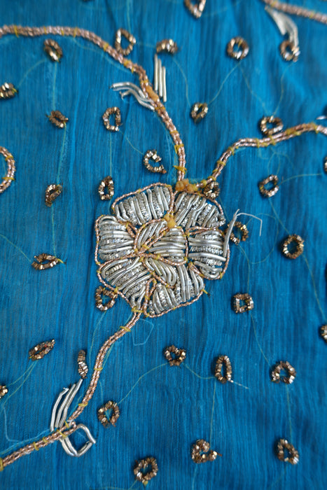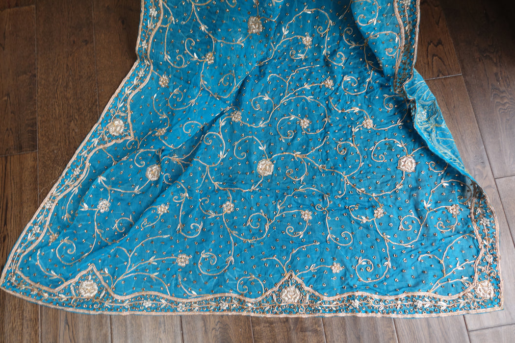Product detail – this is a vintage peacock blue wedding dupatta, it is embellished with metallic zardosi wirework as well as antique gold and silver braids and small beads.  It has a tiny mark on it which is not noticeable.