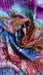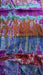 This handcrafted piece features broad horizontal panels showcasing an electrifying combination of colours—including vibrant fuchsia, striking blue, rich orange, and deep purple. The patterns appear to be a mix of tie-dye and abstract prints, creating a stunning, artistic effect.
