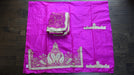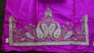 Description – This is a vintage pure silk suit masses of embellishment work which includes a cream fabric applique, this hand finished with masses of gold sequins, beads, silver wirework, gold and silver braid work as well as fine zardosi work.  The work marks out the design of the kameez hem front, sleeves and salwar hems