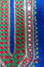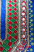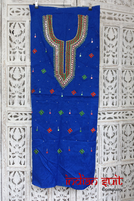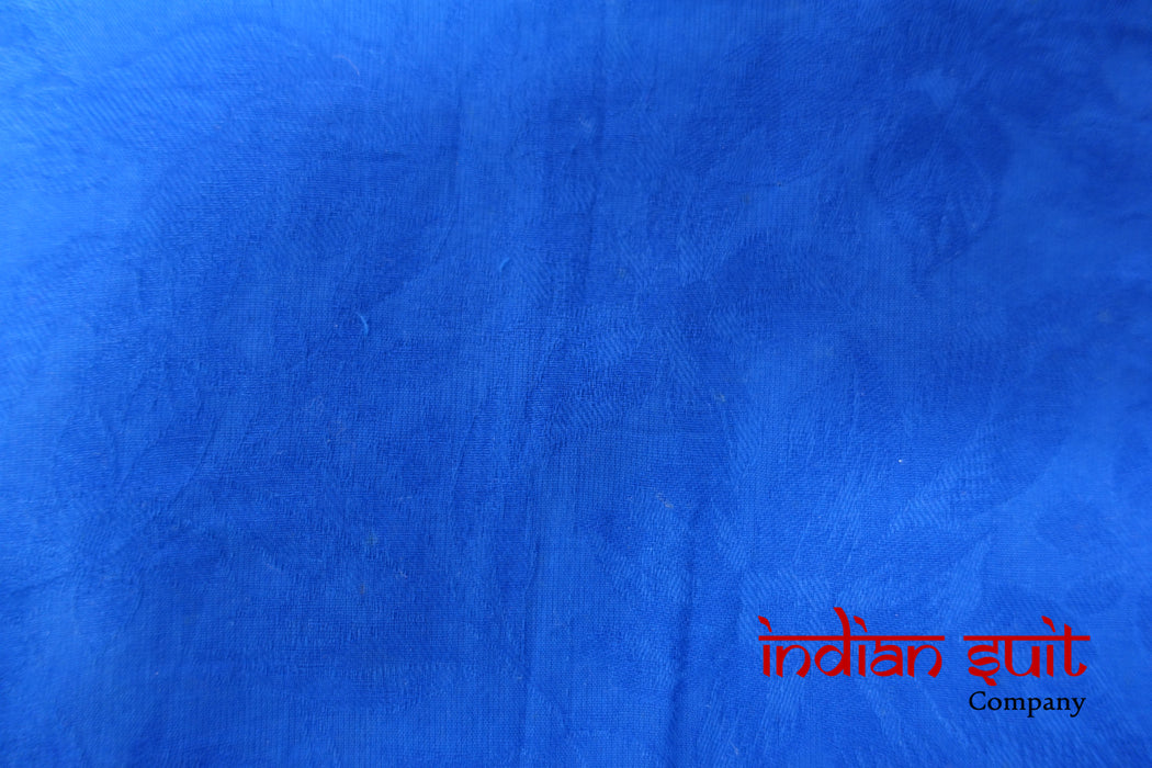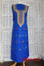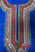 This is a blue self-printed cotton, the front of the dress features embroidery in pink and green.