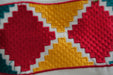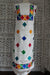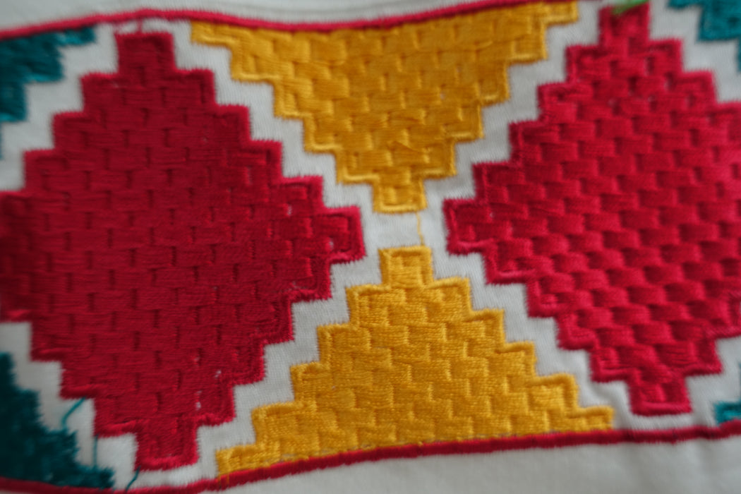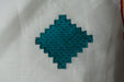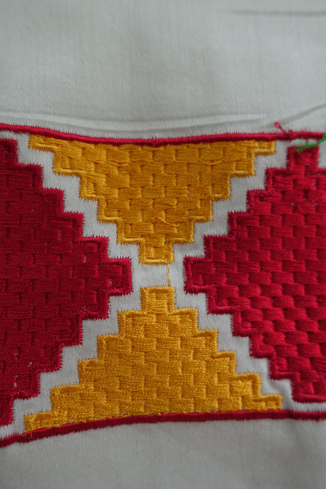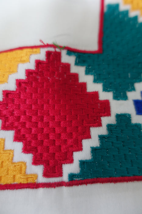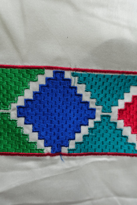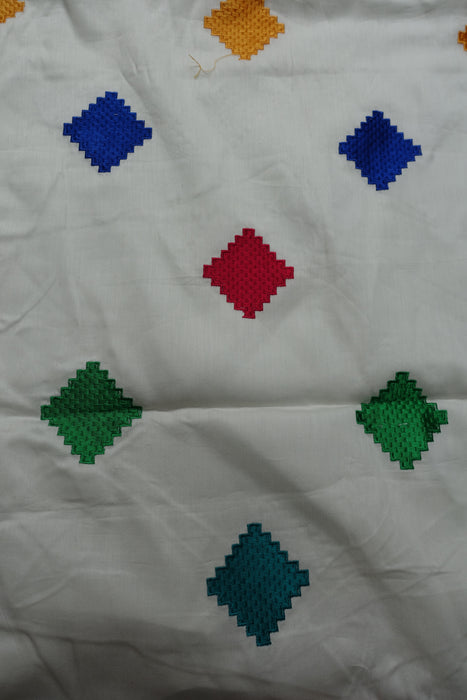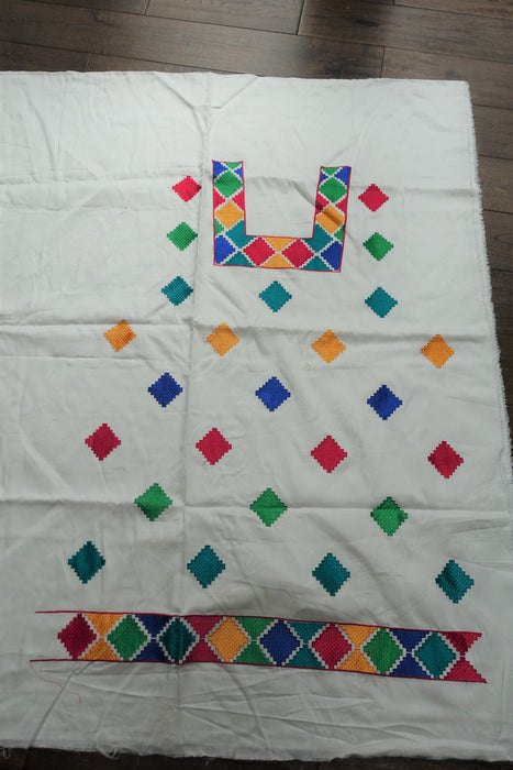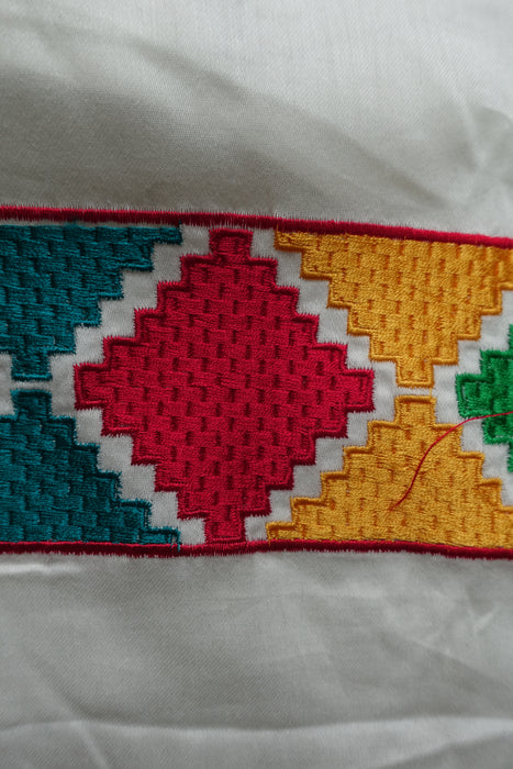 This is a soft white cotton with a slightly sateen sheen to it.   It has bright coloured embroidery work around the square shaped neckline and on the front