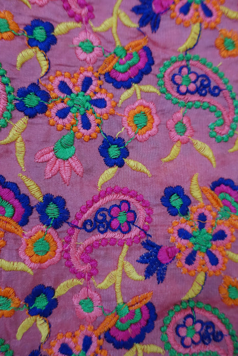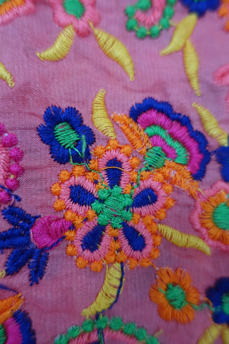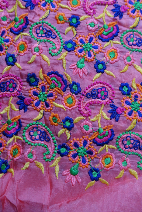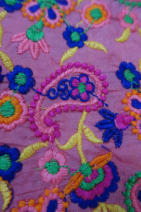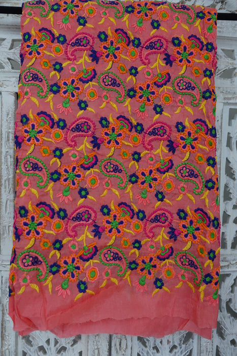 This is a length of reclaimed fabric, peach background with colourful embroidery work throughout.