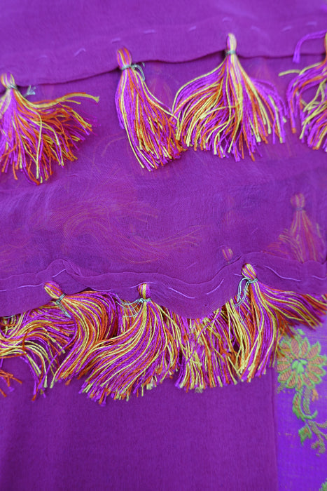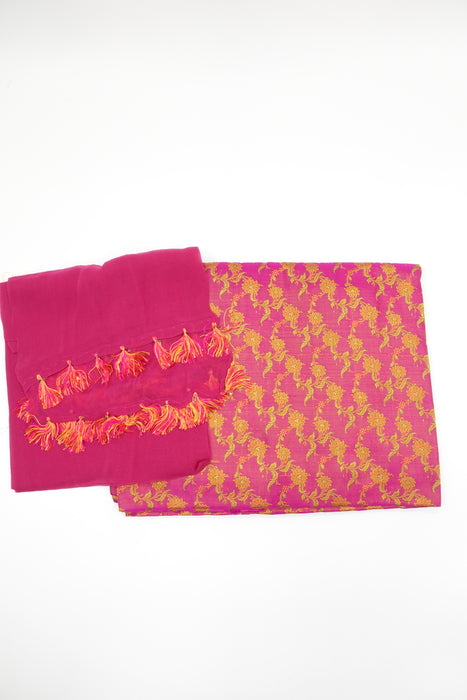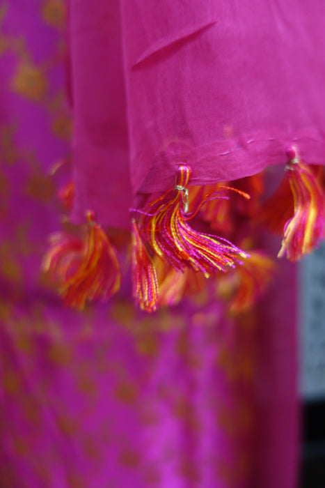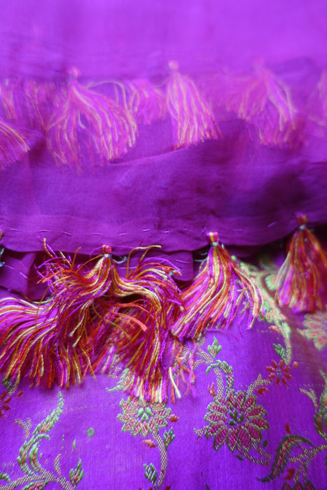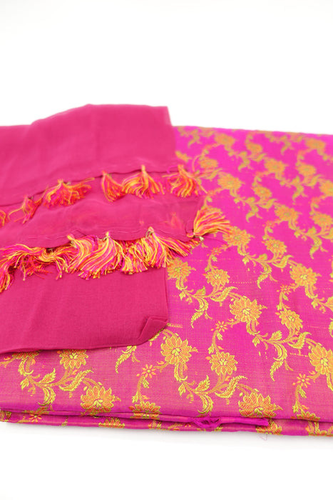 This is an almost two tone woven brocade silk with floral detailing ins hades of orange and green against a pink background.