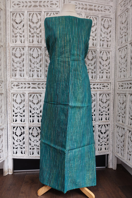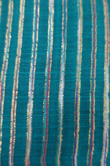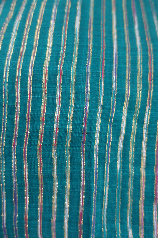 This is a teal stripe cotton silk blend measuring 120 x 3.8 metres. It has has metallised gold,ochre, maroon and turquoise threads.
