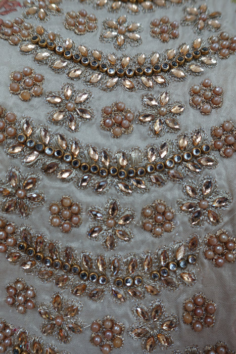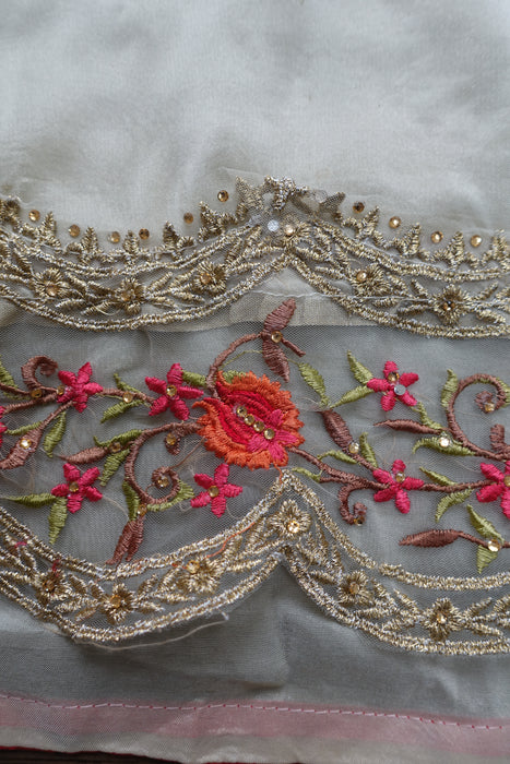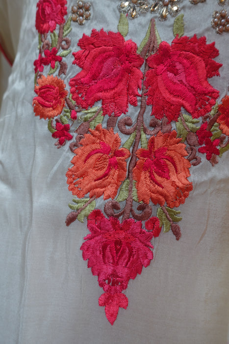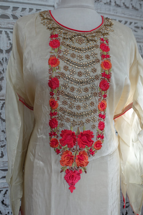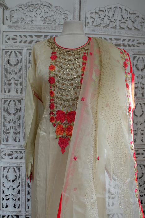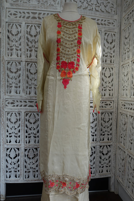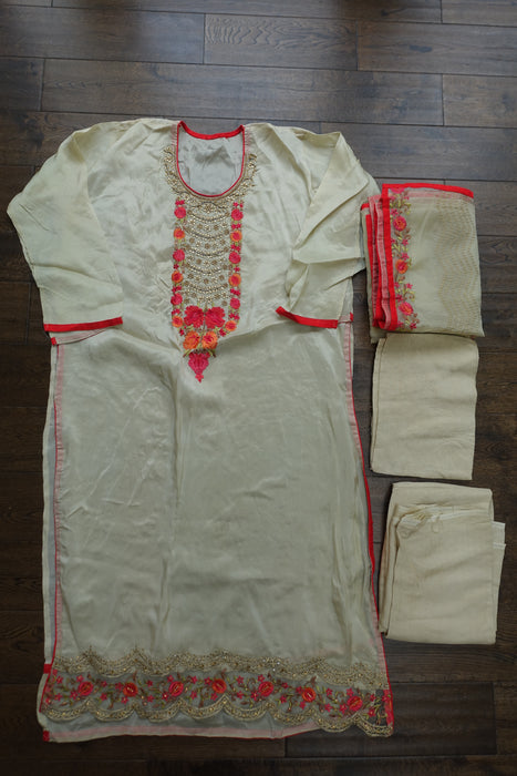 Exquisite and elegant, the cream chanderi silk embroidered with lining and organza dupatta is sure to turn heads. This semi-stitched design features intricate bead detailing for a truly luxurious feel. With two sets of linings and an ornate embroidered organza dupatta included, it is perfect for special occasions.