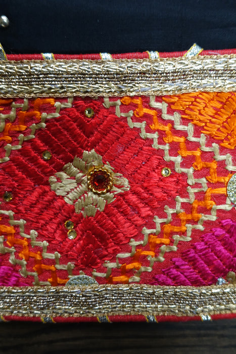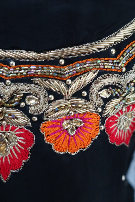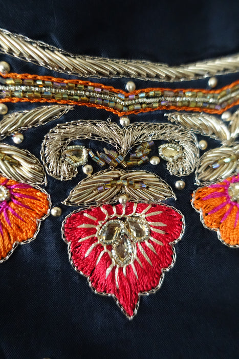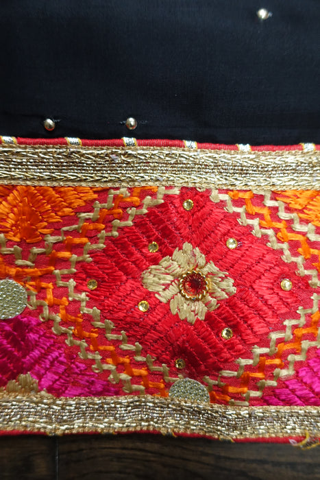 Description – this is made of chanderi silk, it has hot dots and a phulkari style border. The neckline is more ornate and features silk embroidery and gold zardosi work, the dupatta is not included.