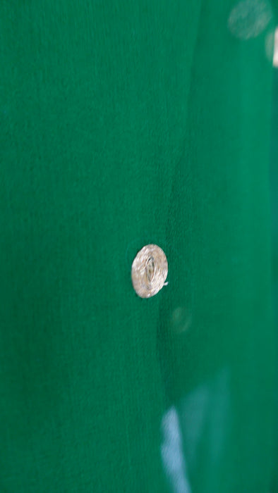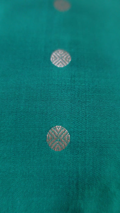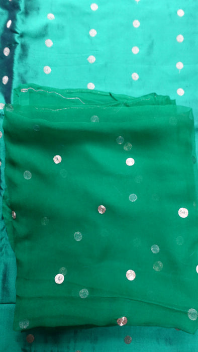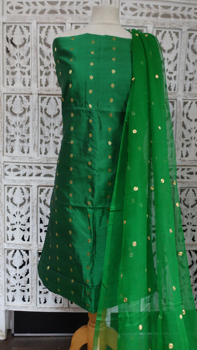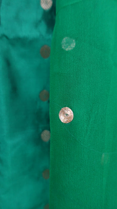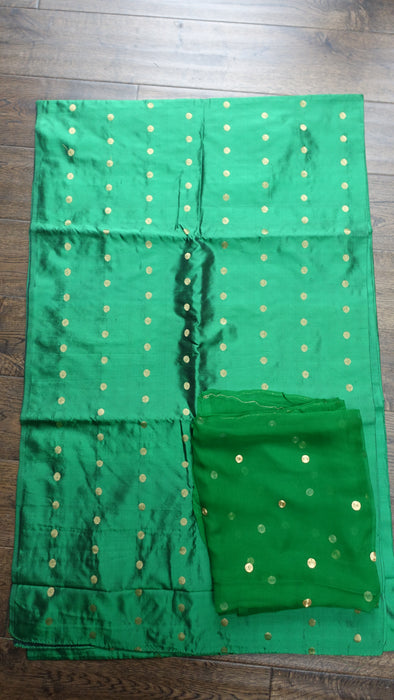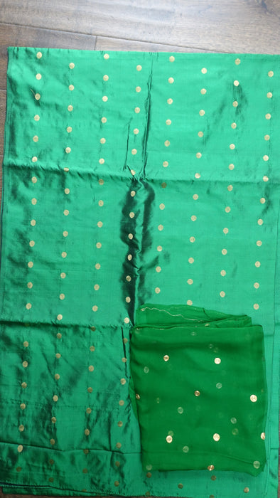 Description : - This is a vintage silk blend with gold round buta woven through the fabric. It comes with a plain green pure silk chiffon dupatta with small gold tilla coils all over.